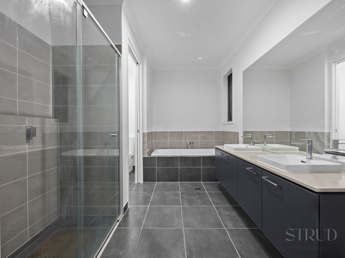 The home’s spacious design offers two separate living areas, giving families the flexibility to spread out or come together with ease. Each of the four generously sized bedrooms features built-in wardrobes and ceiling fans, while the master suite stands out as a true retreat, featuring a walk-in robe and a stunning ensuite with a double vanity, bathtub, separate shower, and private toilet. A second bathroom also includes both a shower and bath, while a separate powder room adds everyday convenience.