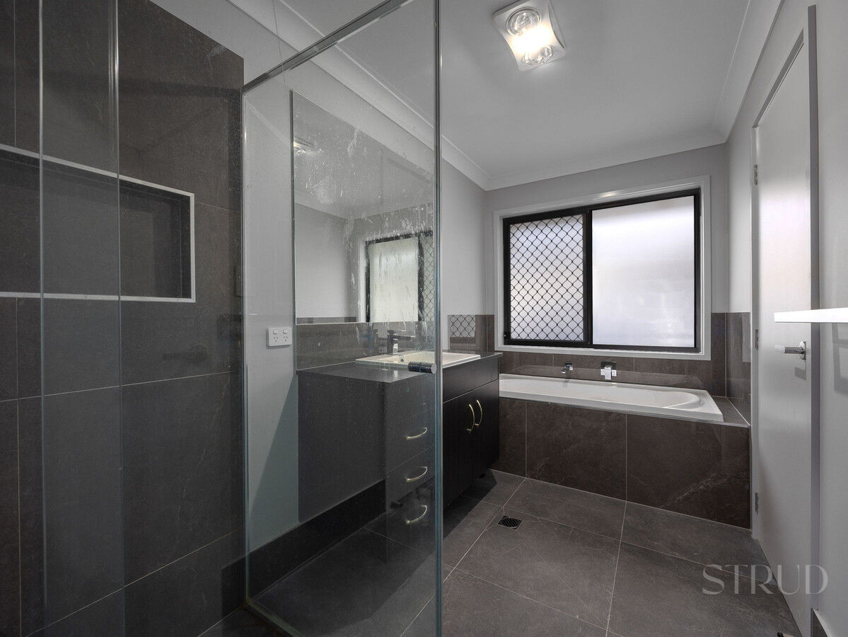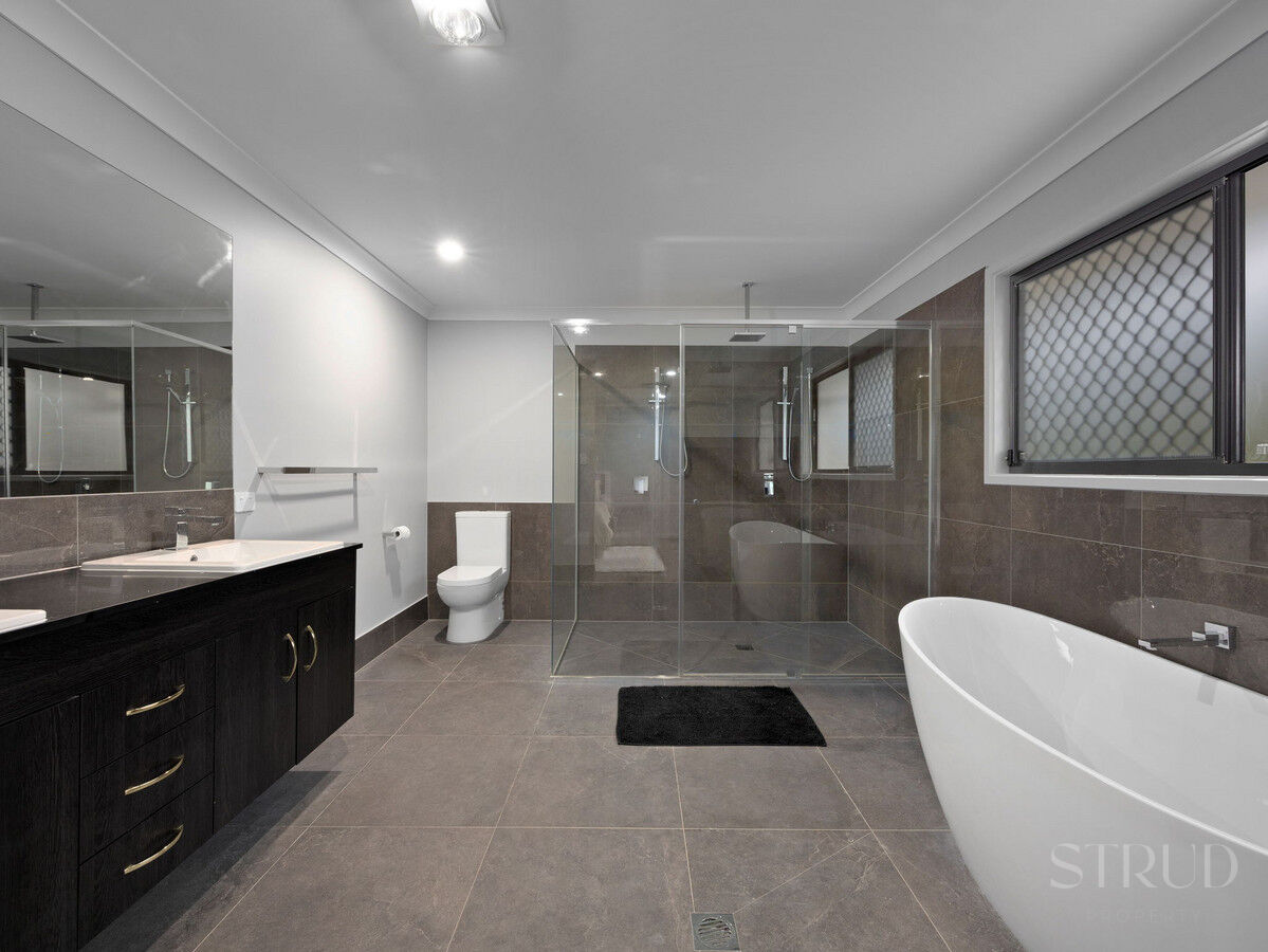 Upstairs, four generously sized bedrooms provide comfortable accommodation, each appointed with hybrid timber flooring, built-in wardrobes and ceiling fans. The master suite offers impressive scale, complete with a walk-in robe and oversized ensuite featuring dual vanities and a bathtub, creating a private retreat that balances comfort with contemporary style.