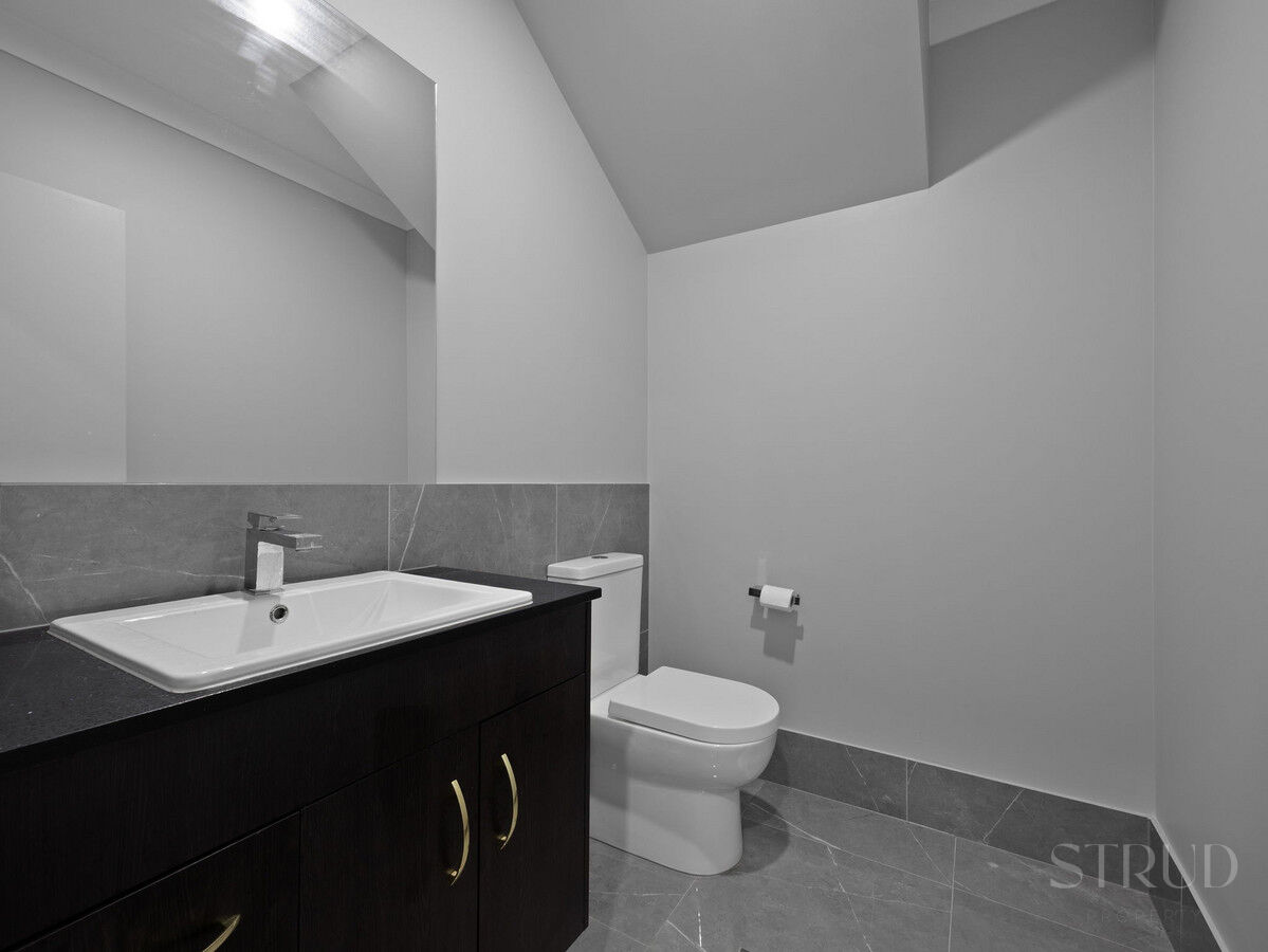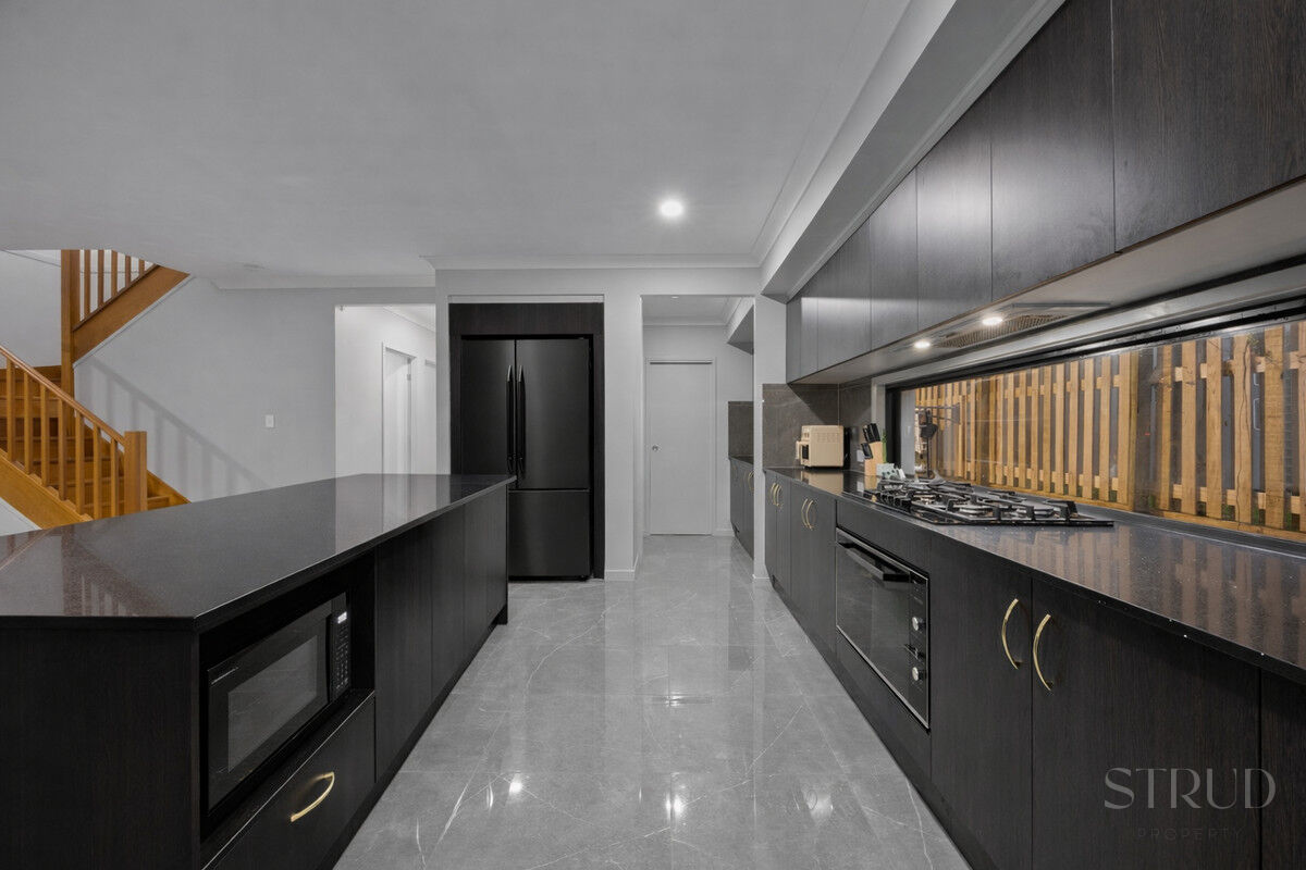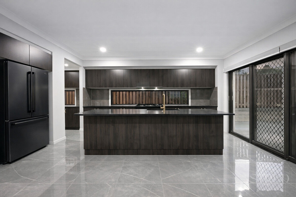 The central kitchen acts as a striking focal point, showcasing black stone bench-tops complemented by bold black cabinetry and a stunning glass splash-back that reflects natural light throughout the space. Designed with both entertaining and everyday functionality in mind, the kitchen features a gas cooktop, extensive preparation space and a substantial walk-in pantry which connects seamlessly to a designated laundry with external access. A contemporary powder room further enhances the usability of the lower level, ensuring convenience for guests and family alike.