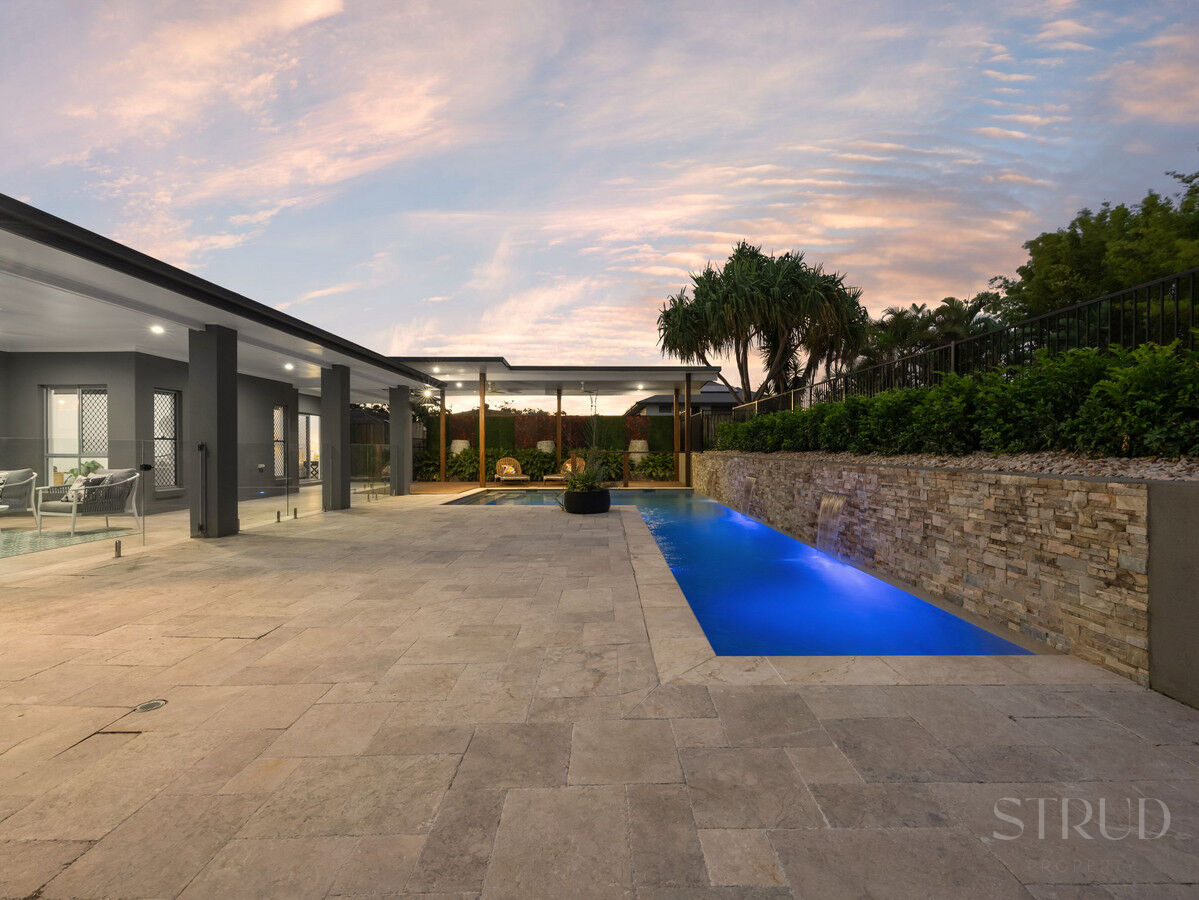 Framed by beautiful landscaping and premium travertine tiles, to the rear of this home awaits a private resort-style haven. Just steps from your back door, a unique and custom in-ground swimming pool presents both a relaxed recreation zone and an extended dedicated lap lane. For everyday living and or entertaining at large, rear zones include a main alfresco, poolside decking with a bar-style bench, a built-in sandstone fire pit, and a rear 300m2 of lush flat lawn accompanied by a fully powered pergola.