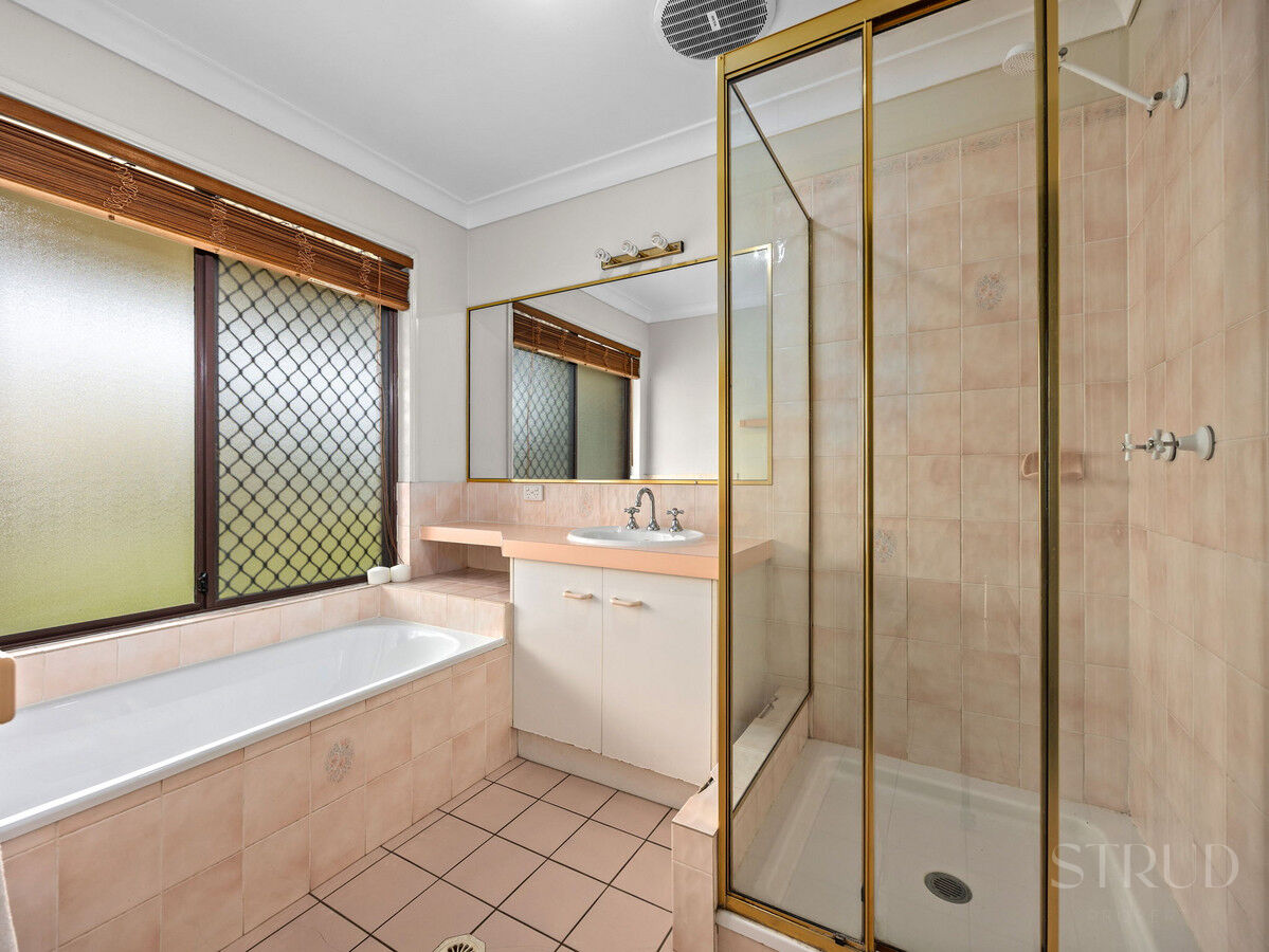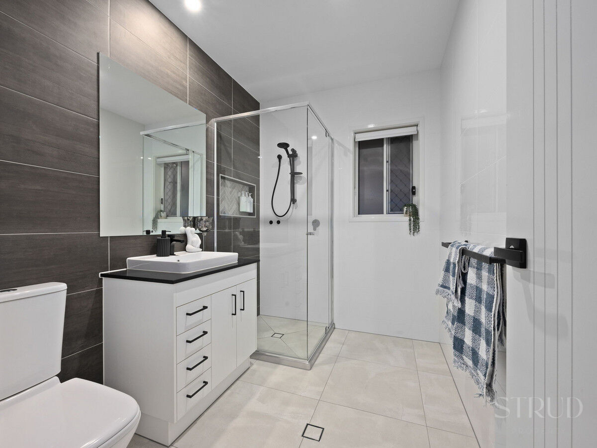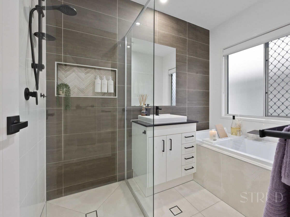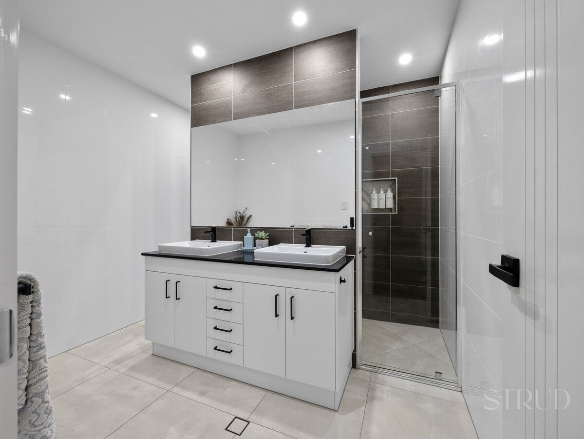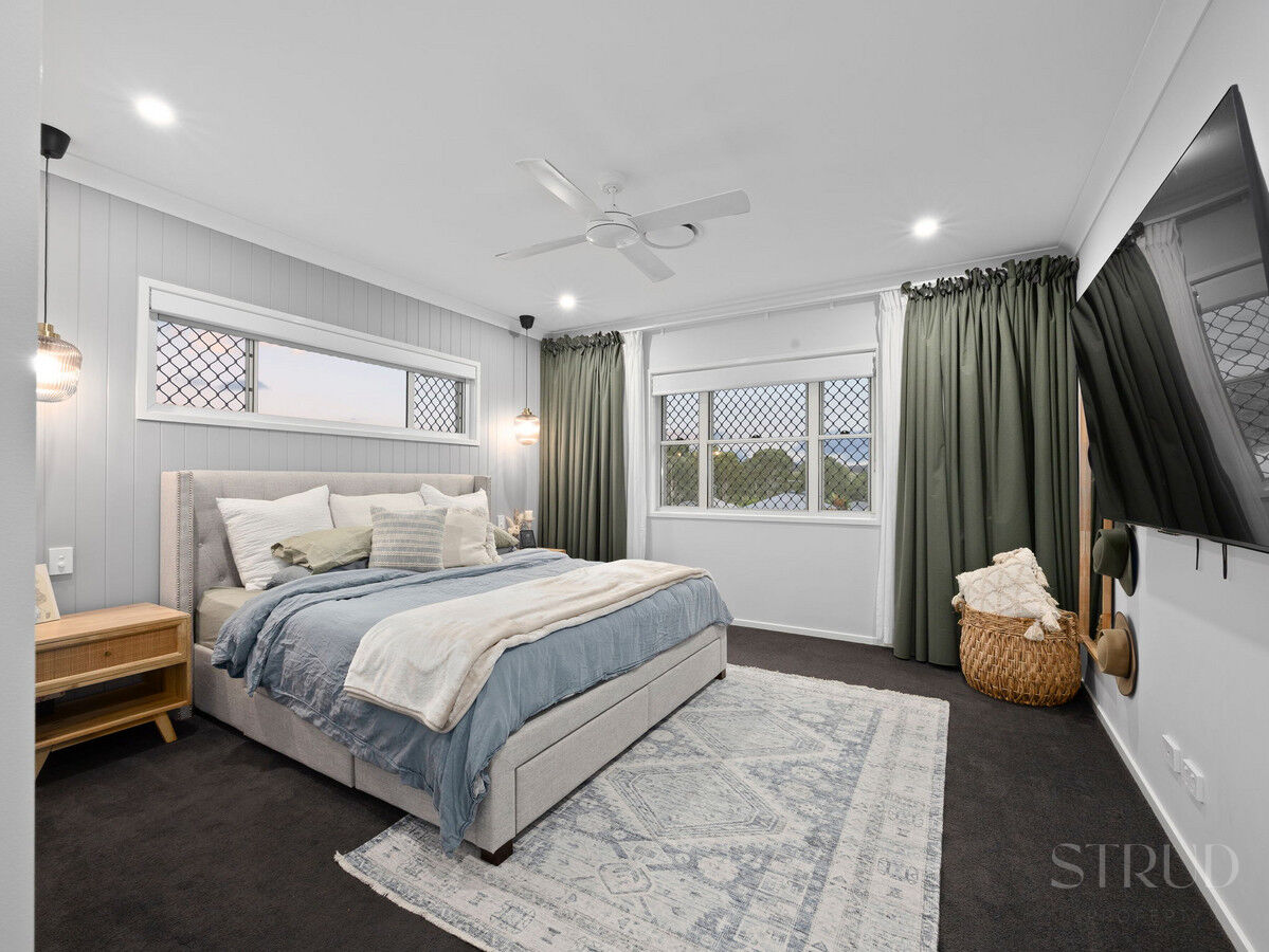 The master suite enjoys beautiful mountain and sunset views and is complemented by a luxurious ensuite featuring double vanities, Caesarstone benchtops, an oversized shower and floor-to-ceiling tiling.