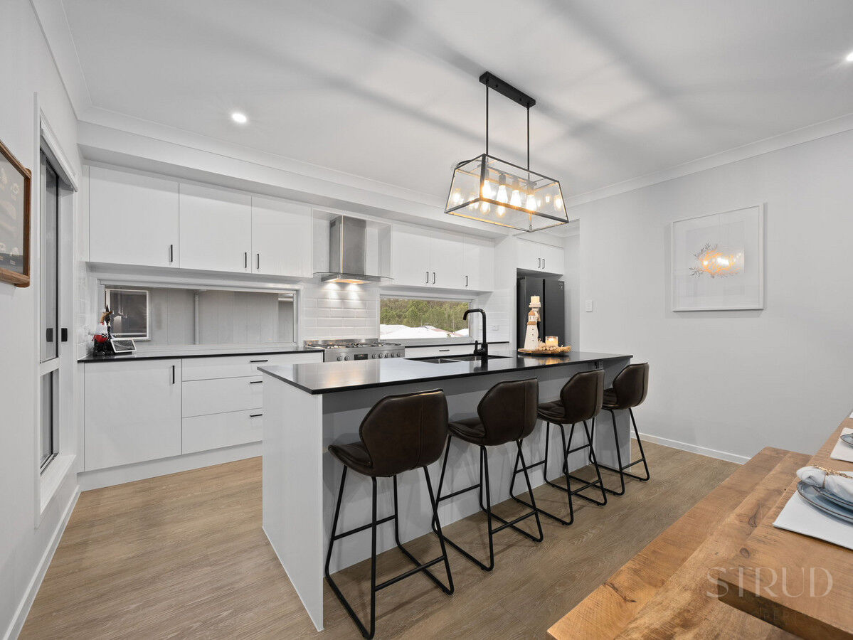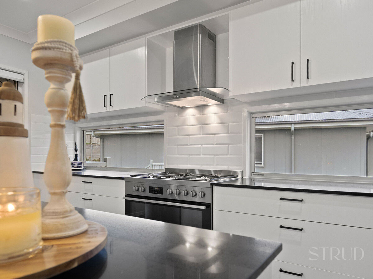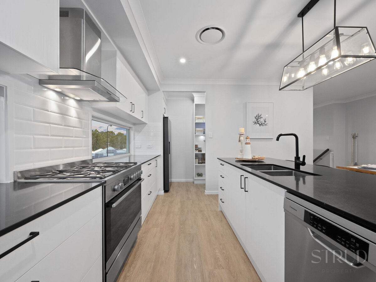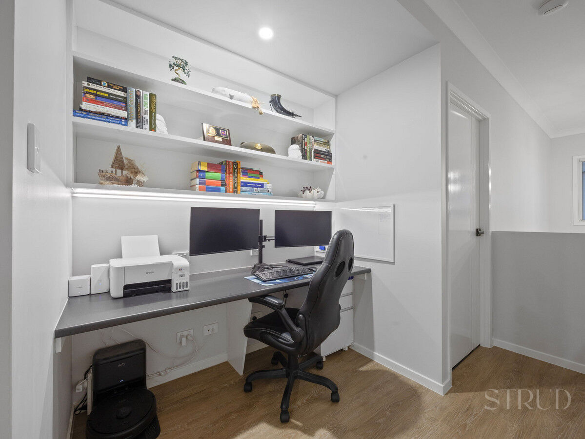 The kitchen is a standout. Stone benchtops, a five-burner gas cooktop, quality appliances, ample storage and a walk-in pantry make it both stylish and highly functional. A double study nook adds everyday practicality, whether for working from home or managing busy family schedules.