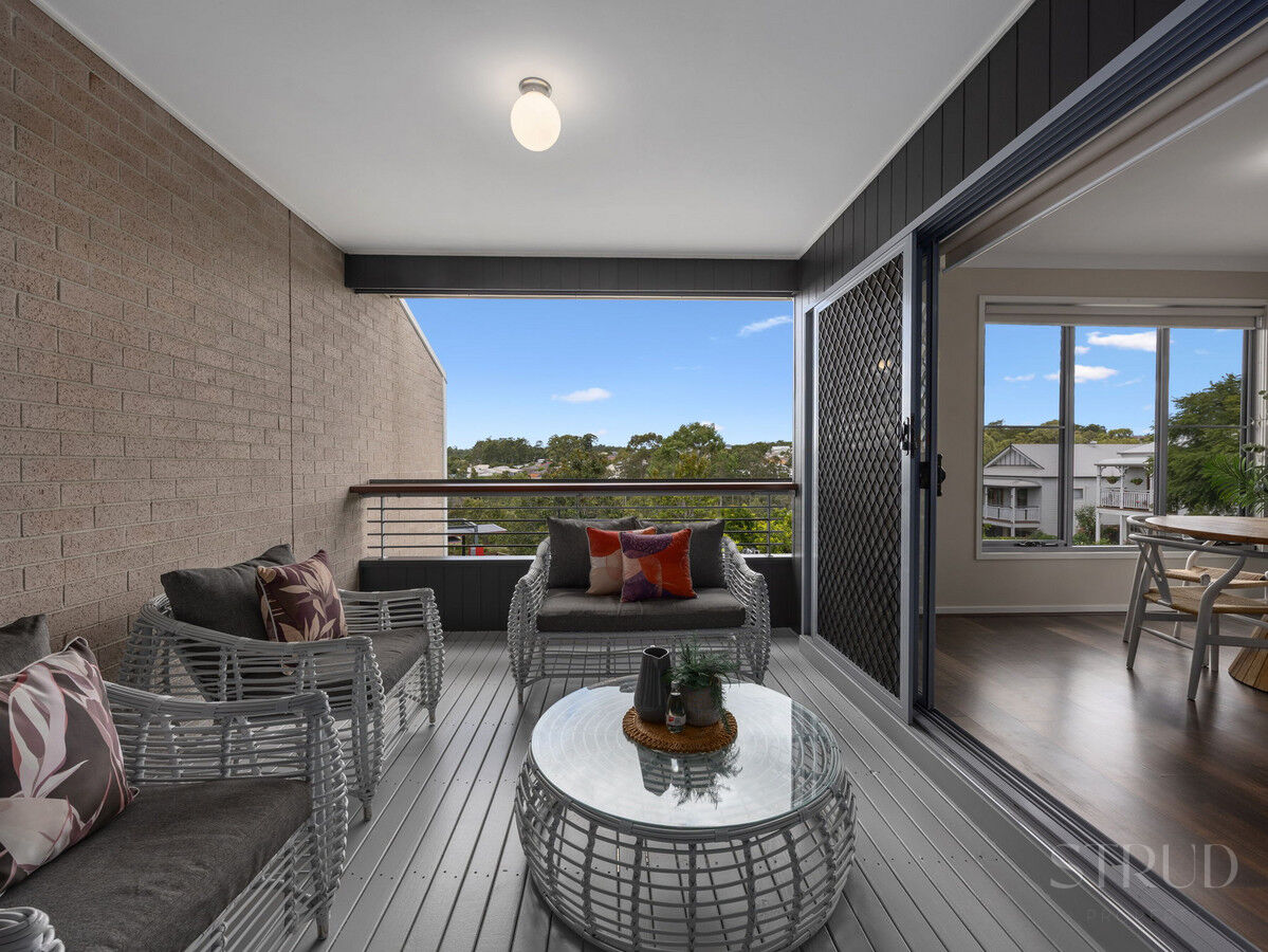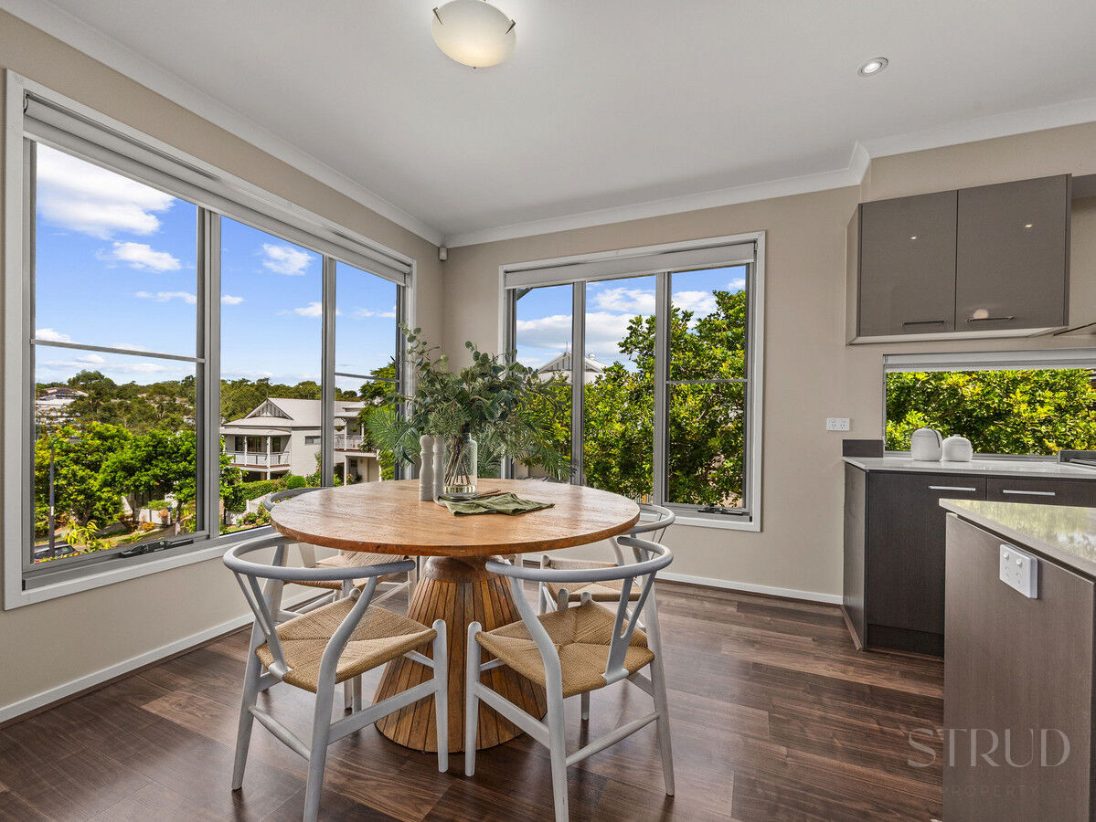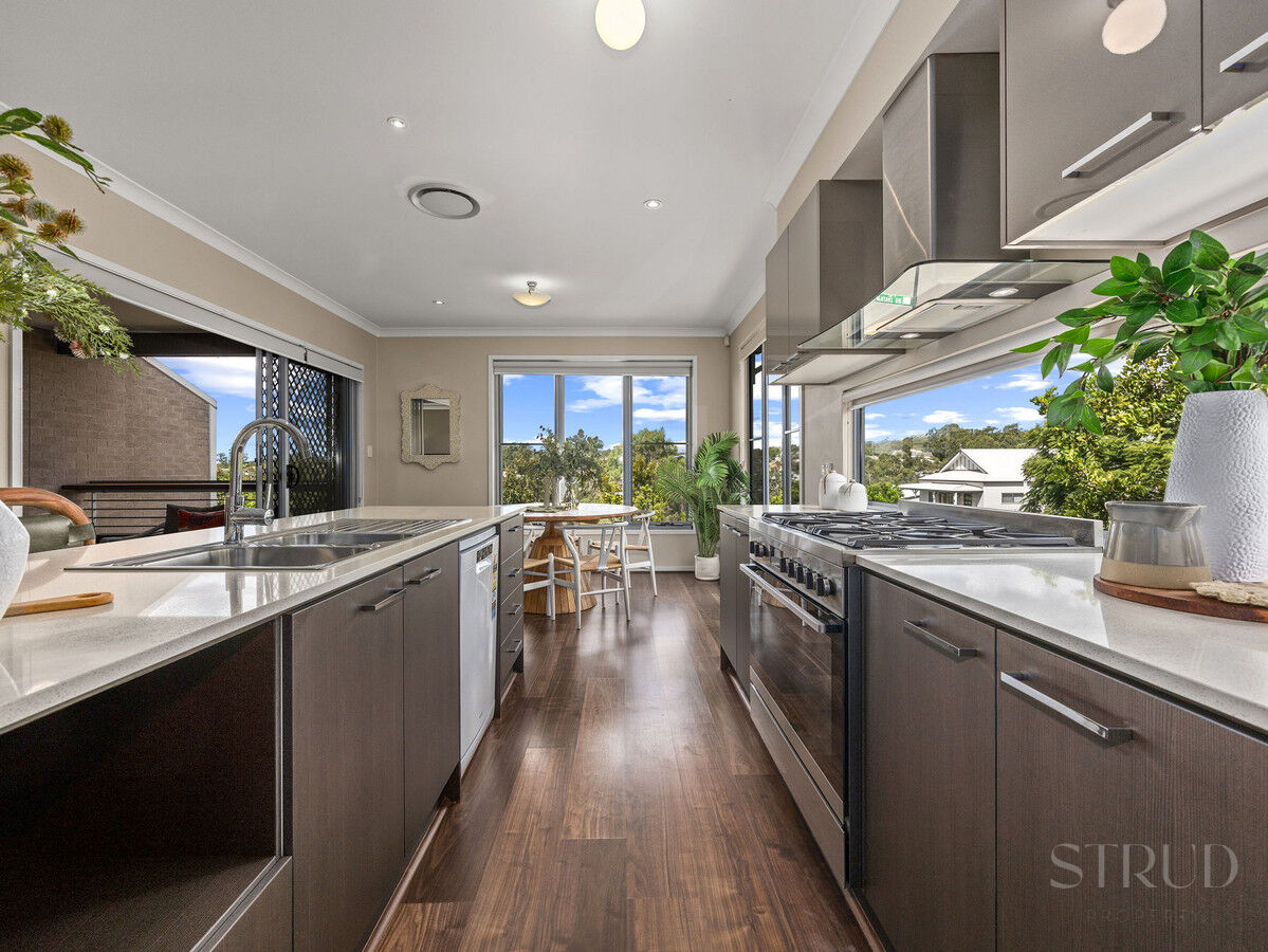 Upstairs is where the home comes to life. A light-filled living and dining area flows straight onto a large covered balcony with elevated, leafy views, private, open, and built for both everyday living and entertaining. The kitchen anchors the space with a long galley layout, 20mm bench tops, island seating, and a 5-burner gas cooktop, all designed to stay connected to indoor and outdoor living. This level also includes an additional bedroom, main bathroom, and a well-sized master suite with walk-in robe and ensuite.