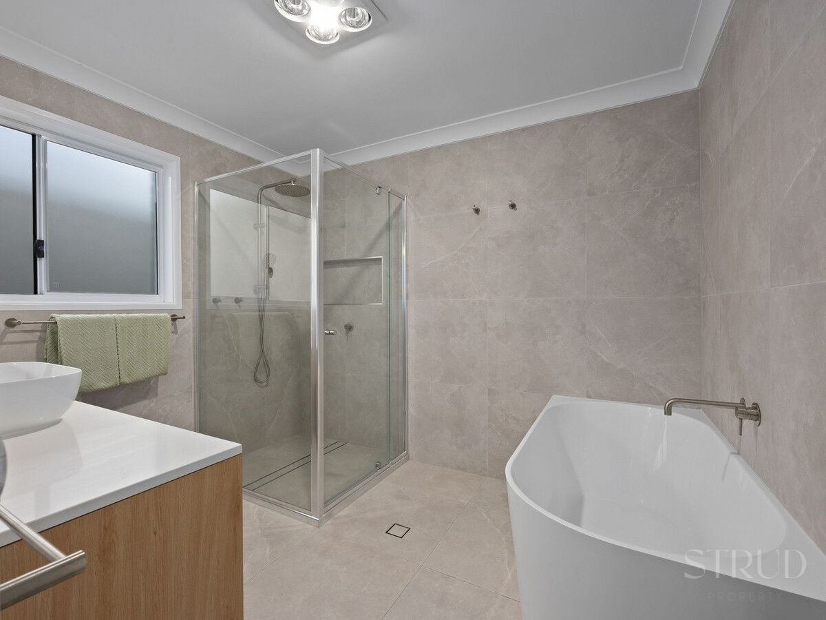 The kitchen is practical and well laid out, offering ample bench and storage space while overlooking the main living areas. Accommodation includes three well-sized bedrooms, with the master bedroom featuring air-conditioning, and all rooms serviced by a stylishly renovated bathroom complete with modern finishes and a freestanding bath.