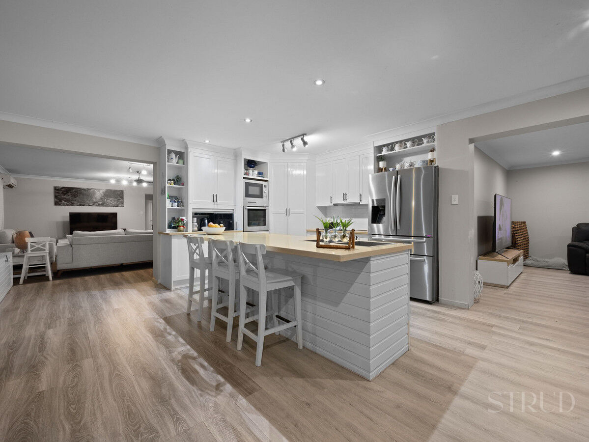 The home is well designed for large families, featuring five bedrooms, each fitted with built-in robes and ceiling fans, and finished with hybrid flooring throughout for durability, comfort and a cohesive modern feel. Air conditioning to the main living areas and the master suite ensures year-round comfort, while multiple living zones allow everyone their own space and create seamless connection between indoor and outdoor areas.