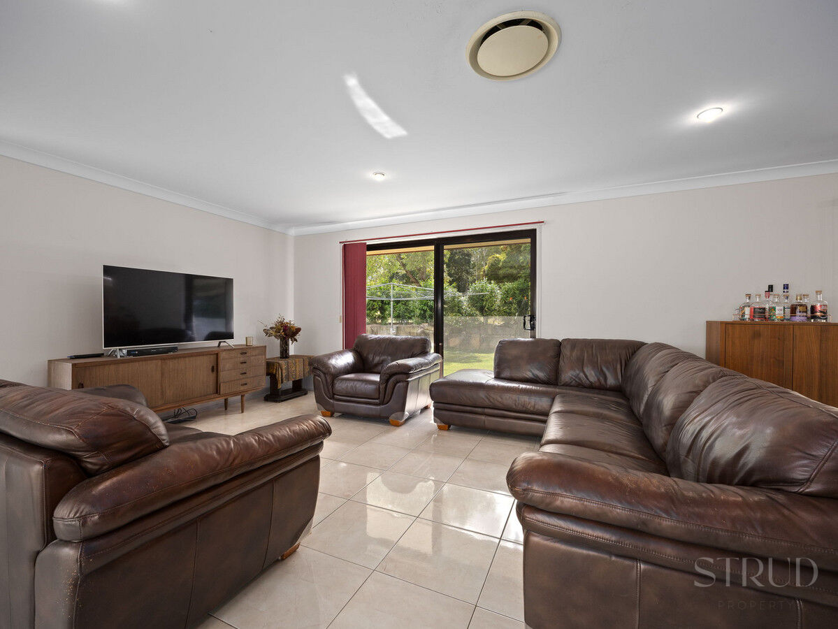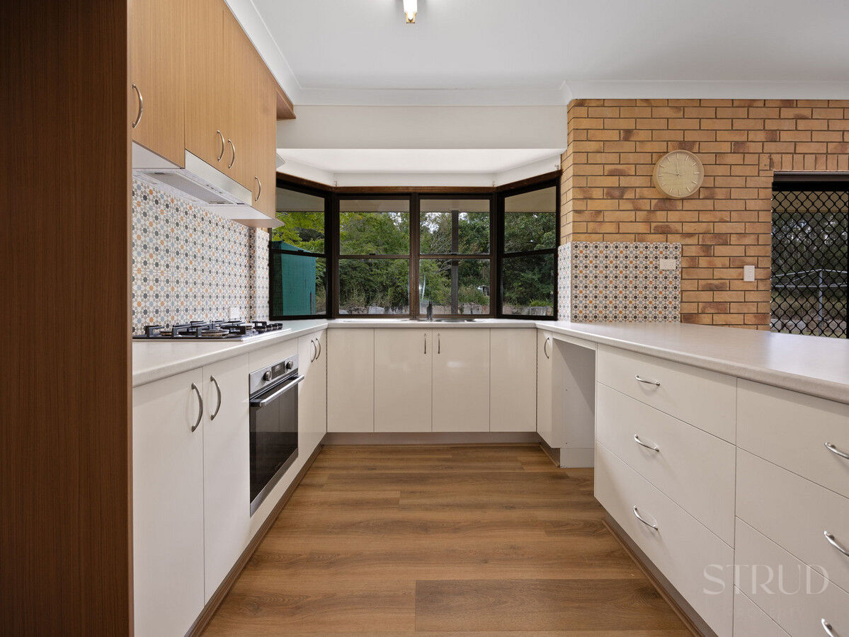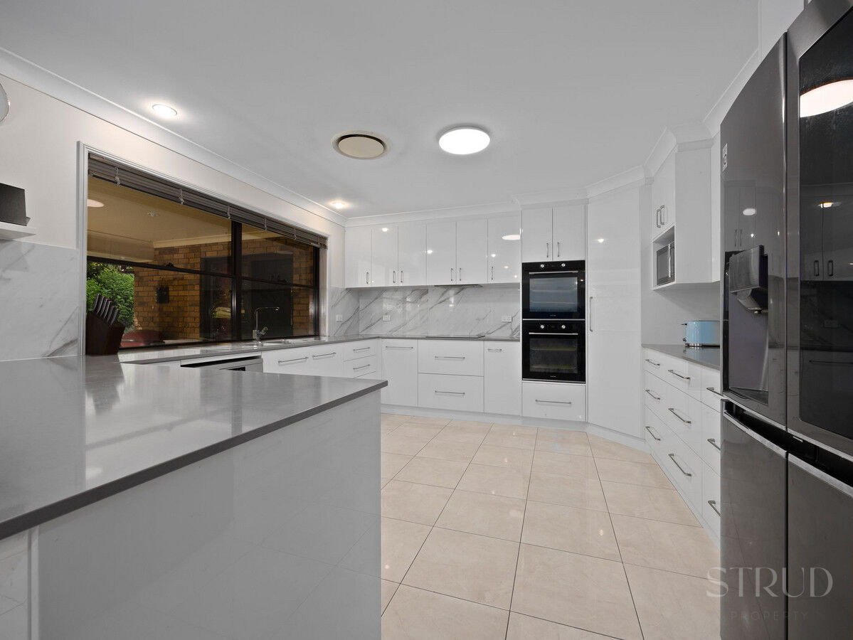 The main residence announces itself with confidence. At its heart sits a beautifully renovated kitchen featuring stone benchtops, a substantial island bench, double wall oven, and quality cabinetry throughout. It is the kind of kitchen that functions as well as it photographs, opening directly into an expansive open-plan living and dining zone where sliding glass doors connect effortlessly to the large columned alfresco. This entertaining area is a genuine standout, a long covered patio with room for a twelve-seat dining setting and a separate lounge arrangement, all overlooking the private, sandstone-terraced rear garden and surrounding bush.