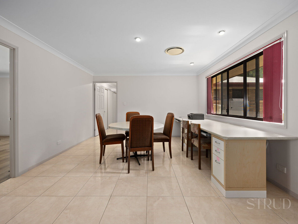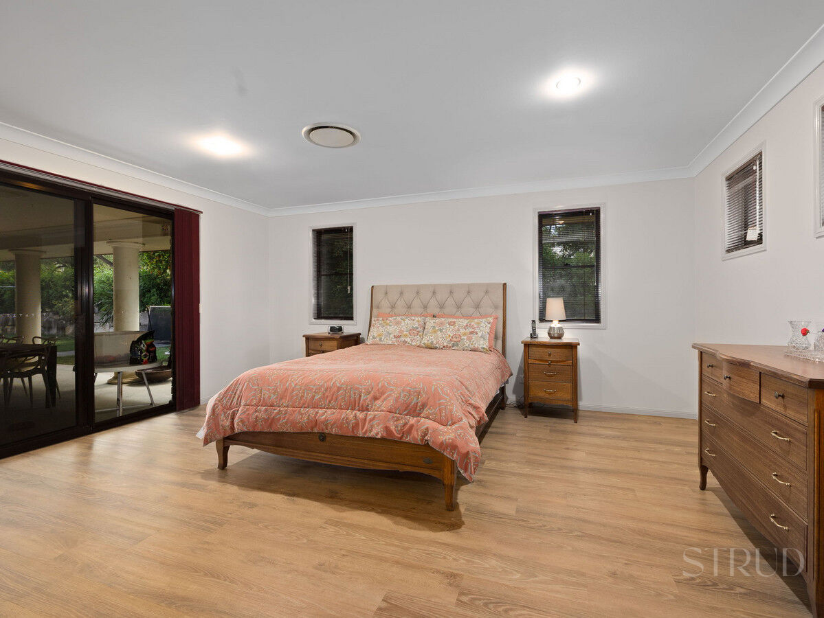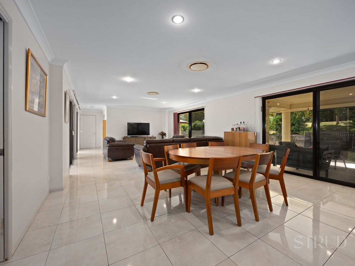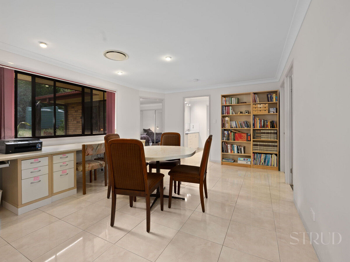 The main residence announces itself with confidence. At its heart sits a beautifully renovated kitchen featuring stone benchtops, a substantial island bench, double wall oven, and quality cabinetry throughout. It is the kind of kitchen that functions as well as it photographs, opening directly into an expansive open-plan living and dining zone where sliding glass doors connect effortlessly to the large columned alfresco. This entertaining area is a genuine standout, a long covered patio with room for a twelve-seat dining setting and a separate lounge arrangement, all overlooking the private, sandstone-terraced rear garden and surrounding bush.