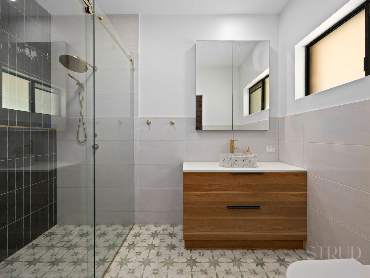 The second dwelling is a fully self-contained residence in its own right, and it presents superbly. A brand new kitchen with stone benchtops, fresh flooring throughout, and air conditioning in every room give it a light and contemporary feel. Two separate living areas provide genuine flexibility of use, and the recently renovated main bathroom is a standout finish, complete with a terrazzo vessel basin, brushed brass tapware, and a frameless glass shower. The master bedroom is serviced by a walk-in robe and ensuite, and five well-sized bedrooms in total make this dwelling viable for a wide range of tenants or occupants.