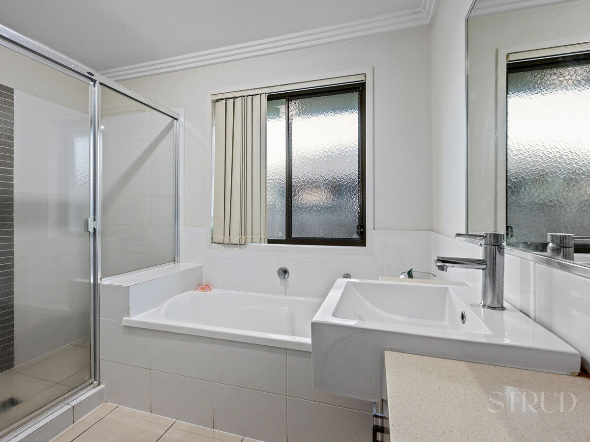 The spacious primary suite provides a peaceful retreat, complete with a walk-in robe and private ensuite. Three additional bedrooms, all fitted with ceiling fans, offer flexibility for growing families, guests, or a home office. The main bathroom continues the home’s quality finishes, featuring a stone vanity, separate shower, and bathtub — perfect for family convenience.