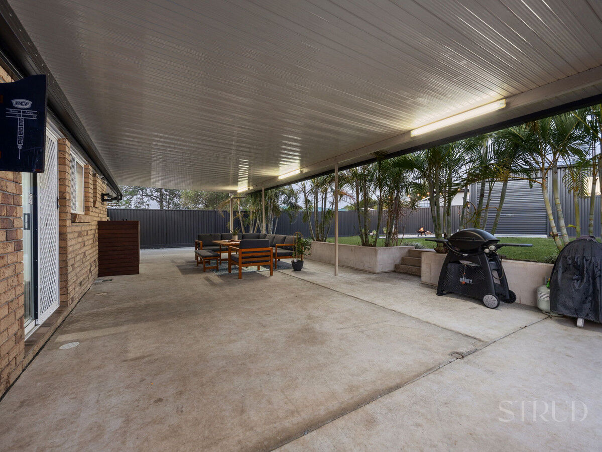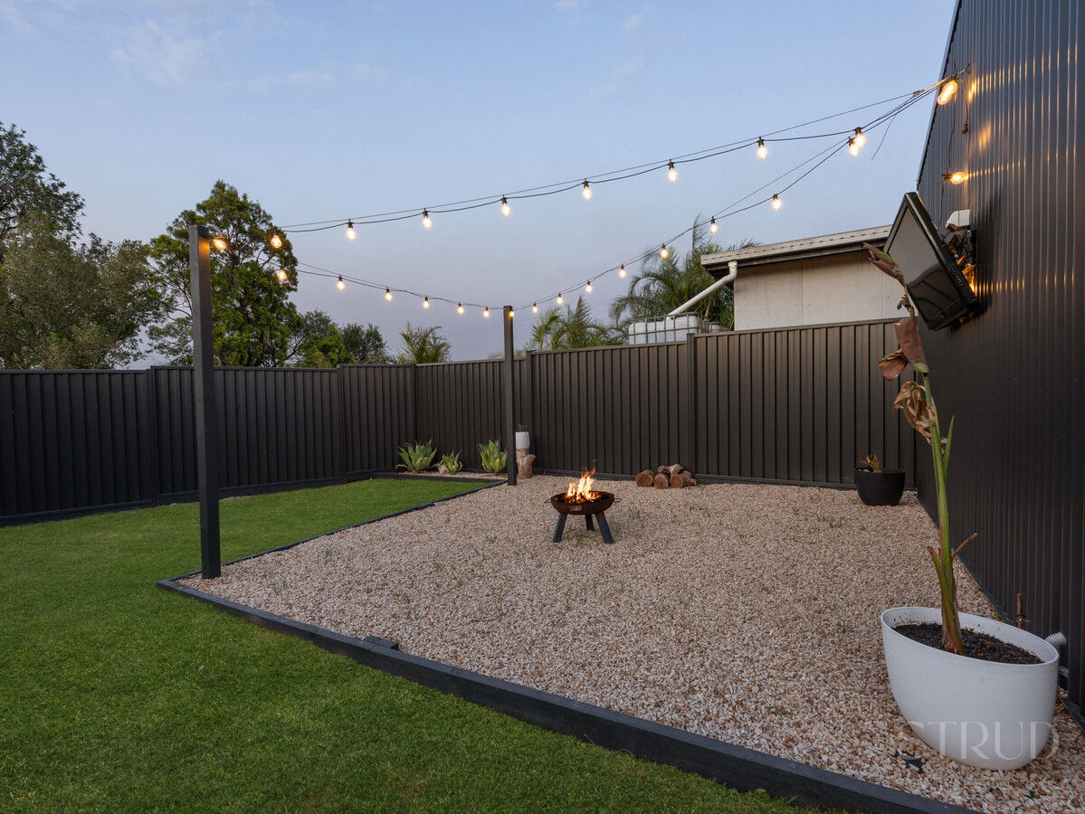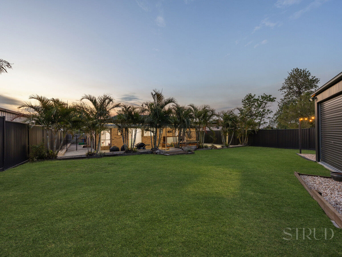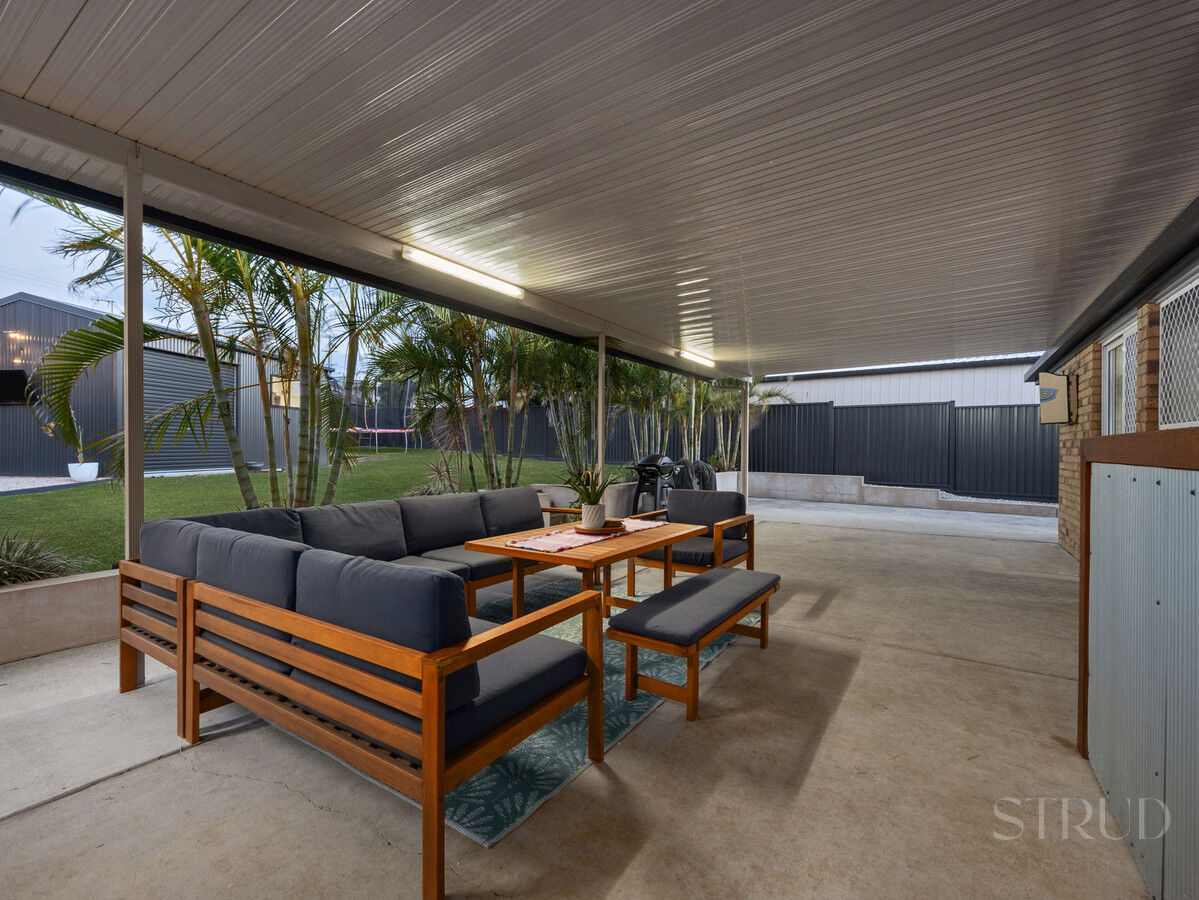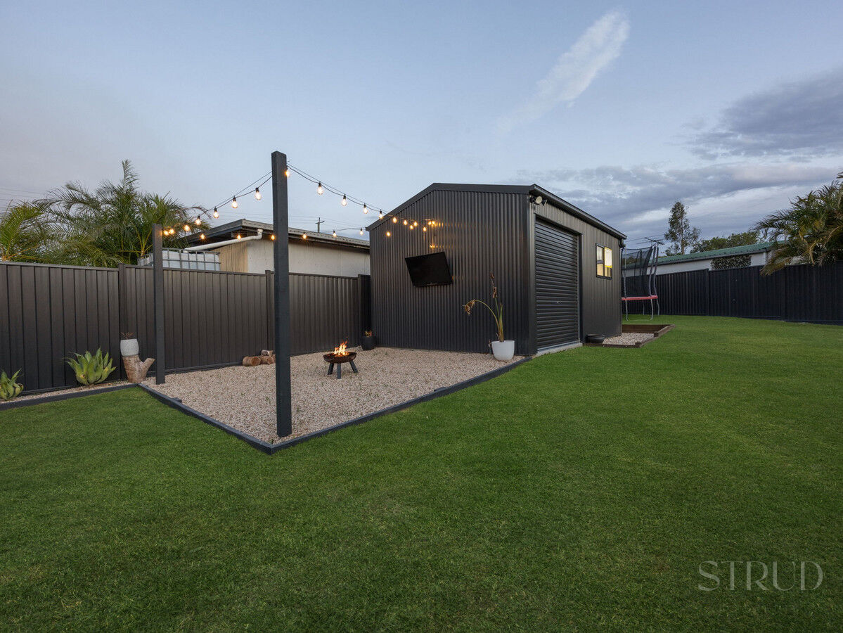 Outdoor living is where this home really shines. A huge covered entertaining area runs the length of the home and overlooks a beautifully kept yard framed by tropical gardens. Beyond that, the standout 3.8 × 5.8 m powered workshop offers space for hobbies, storage, or a home gym, with an adjoining gravel fire-pit zone and outdoor TV setup perfect for evenings with friends. There’s still plenty of grass for kids and pets to play, all secured by colourbond fencing for peace of mind.