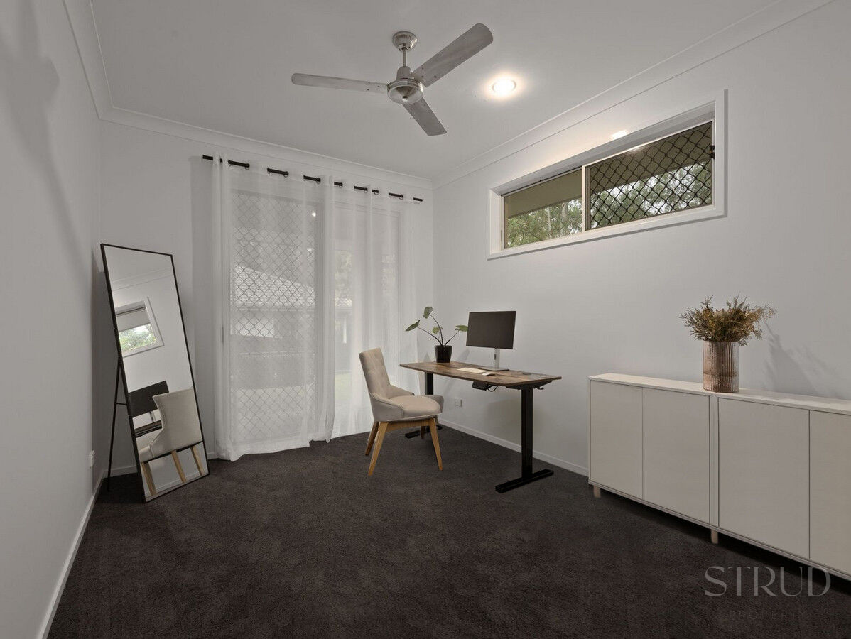 The master suite is privately positioned and accessed via double feature doors, complete with a walk-in robe and a well-appointed ensuite. A secondary living zone positioned nearby provides flexibility as a private retreat or executive lounge. Three additional bedrooms are generously scaled, each fitted with built-in robes and ceiling fans, while a well-finished central bathroom services the remainder of the home. Notably, one guest bedroom enjoys direct patio access, a thoughtful inclusion that enhances versatility and indoor-outdoor flow.