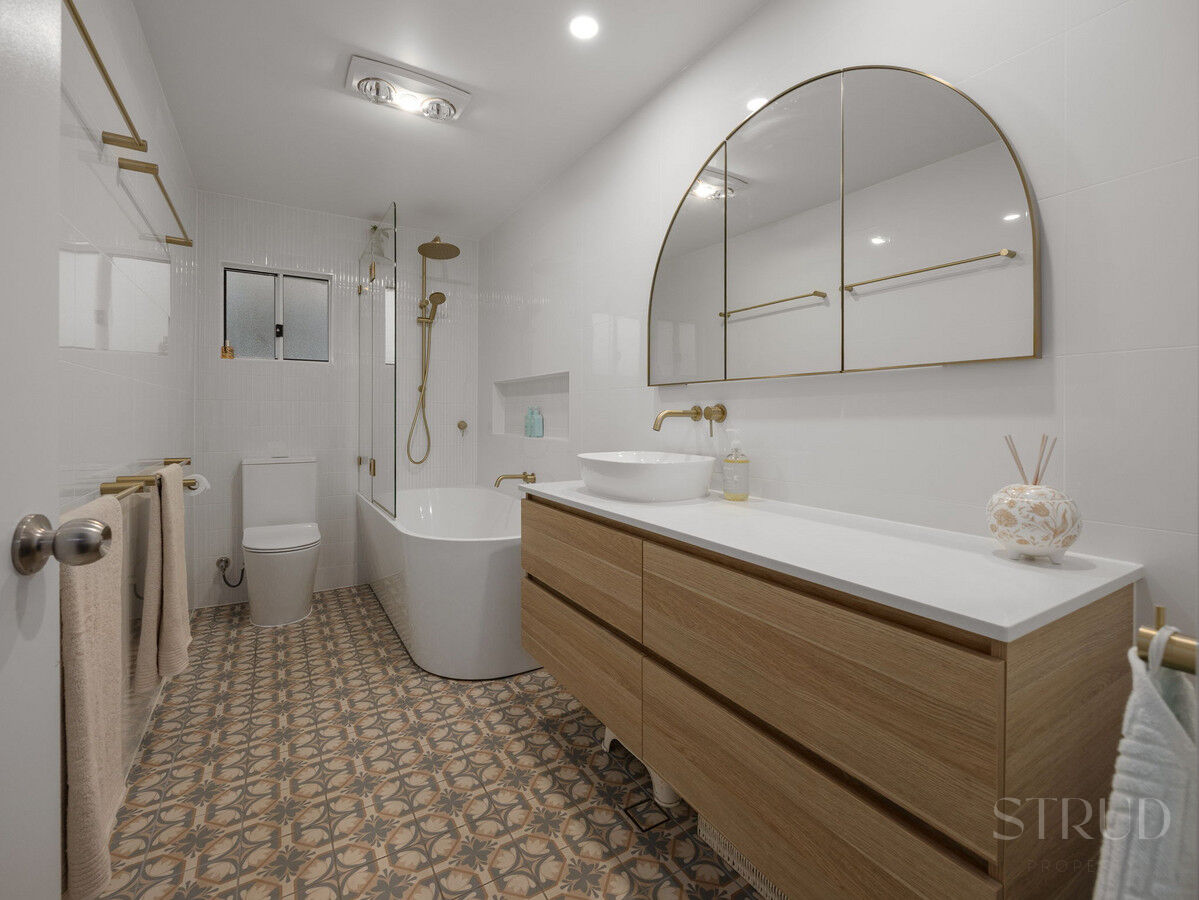 Inside, the home features a practical and tastefully renovated layout, comprising three bedrooms and one bathroom. Each bedroom is well sized and include wardrobes and ceiling fans for year-round comfort. The bathroom has been thoughtfully updated, showcasing feature floor tiling and elegant gold hardware that adds a touch of style and sophistication.
