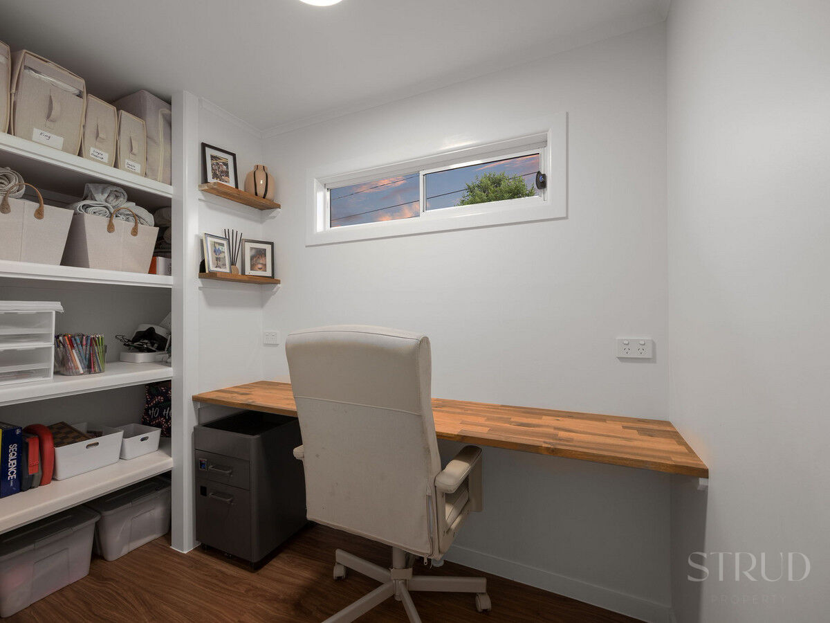 The home also features a well-appointed laundry complete with generous storage and bench space. Plantation shutters throughout the bedrooms and main living area add a touch of luxury, allowing natural light to filter in while maintaining privacy. An air-conditioned main living space ensures comfort during the warmer months, while a thoughtfully positioned study at the front of the home provides the ideal setting for working from home or pursuing creative projects.