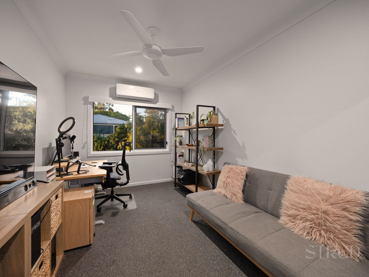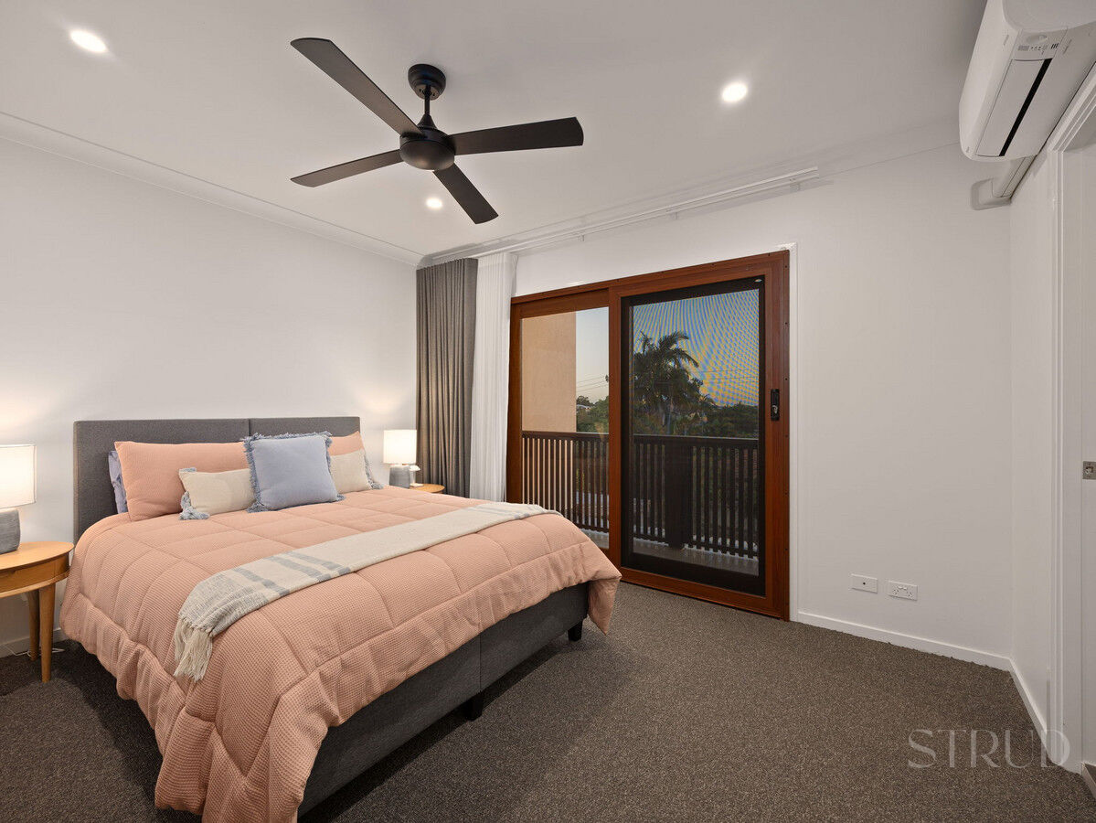 Upstairs, the master suite is positioned as a private retreat. It enjoys direct access to its own balcony, along with a walk in robe and well finished ensuite. Air conditioning in the master ensures comfort through every season. The additional two bedrooms are well proportioned, each fitted with built in robes and ceiling fans, and are serviced by a modern central bathroom with quality fixtures and a sleek finish.