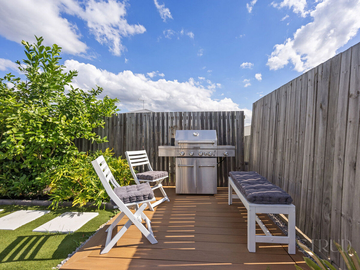 Step outside to a covered alfresco area that flows to a charming deck tucked in the corner of the backyard, complete with a barbecue and seating for entertaining or enjoying quiet moments outdoors. The fully fenced, low-maintenance backyard ensures plenty of space for relaxation and play, while a dual remote garage adds to the home’s practicality.