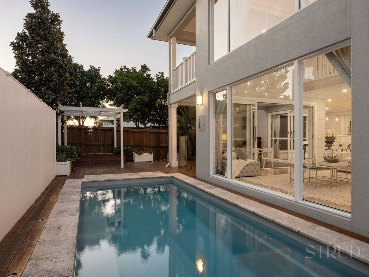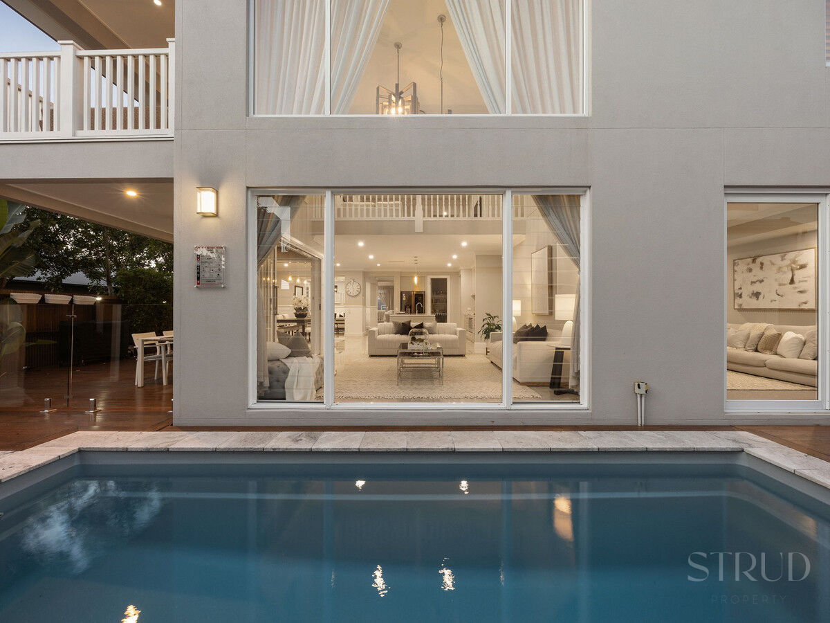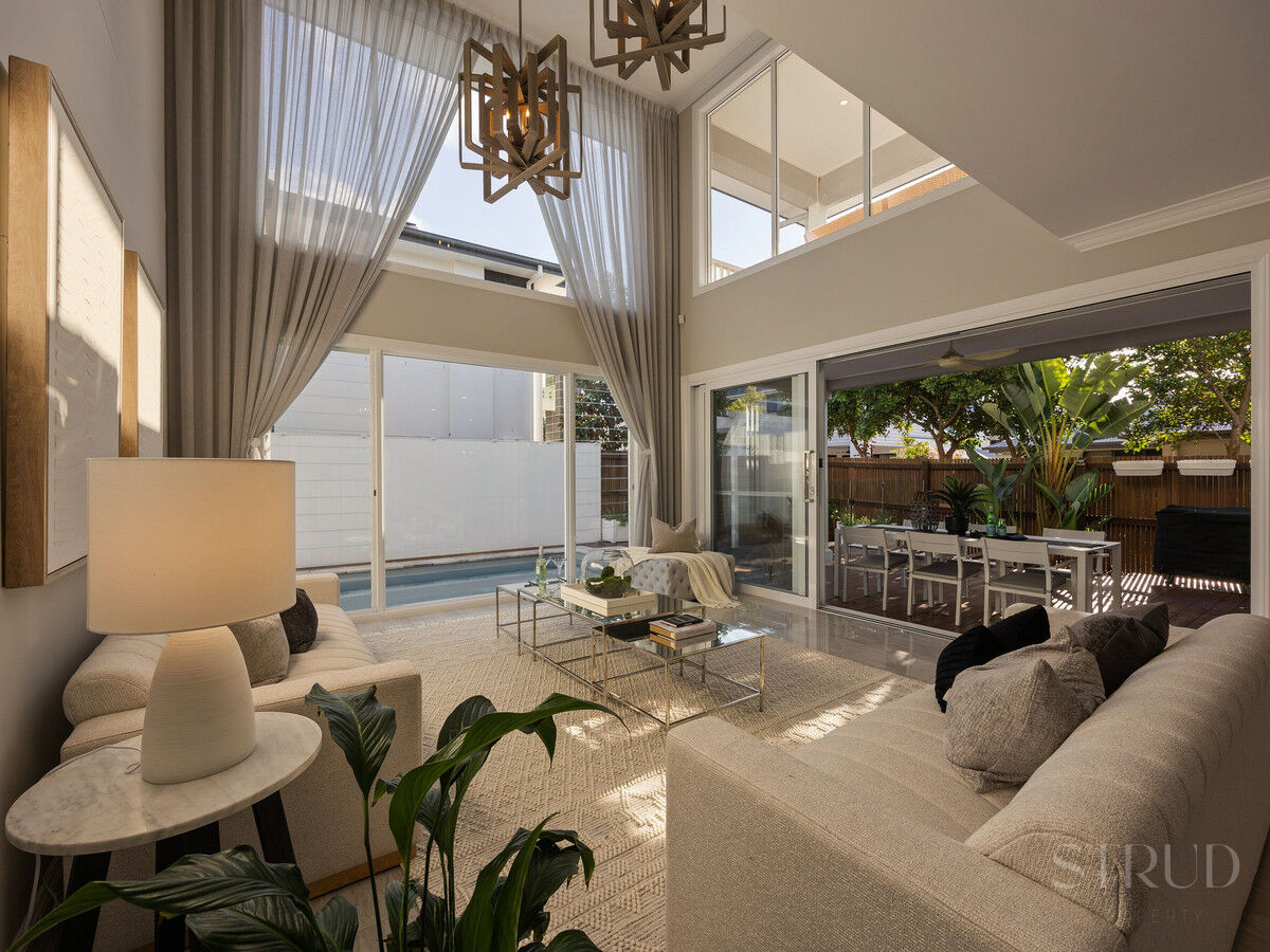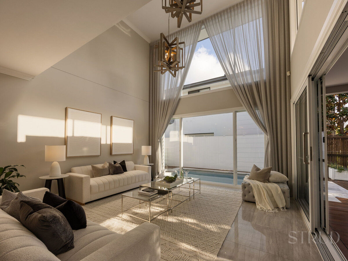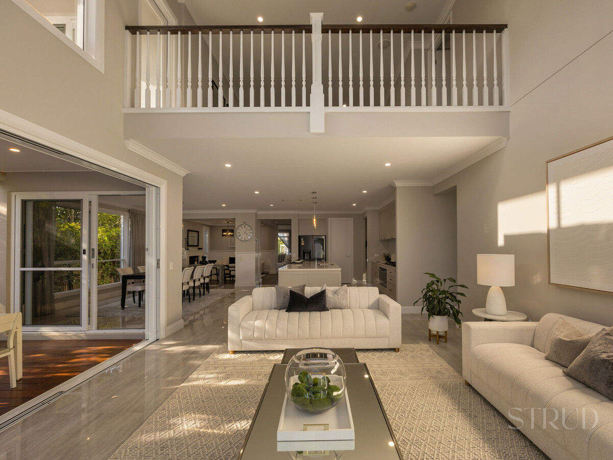 Beyond this, the home opens into a breathtaking expanse of air and light. A soaring double-height void fills the central living area with warmth and volume. Glass walls frame views to the rear alfresco and magnesium-heated pool, edged in travertine stone and surrounded by greenery for complete privacy. The connection between indoors and out feels effortless, a design that invites both celebration and stillness.