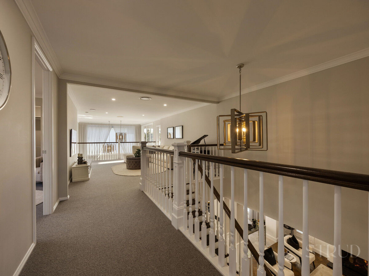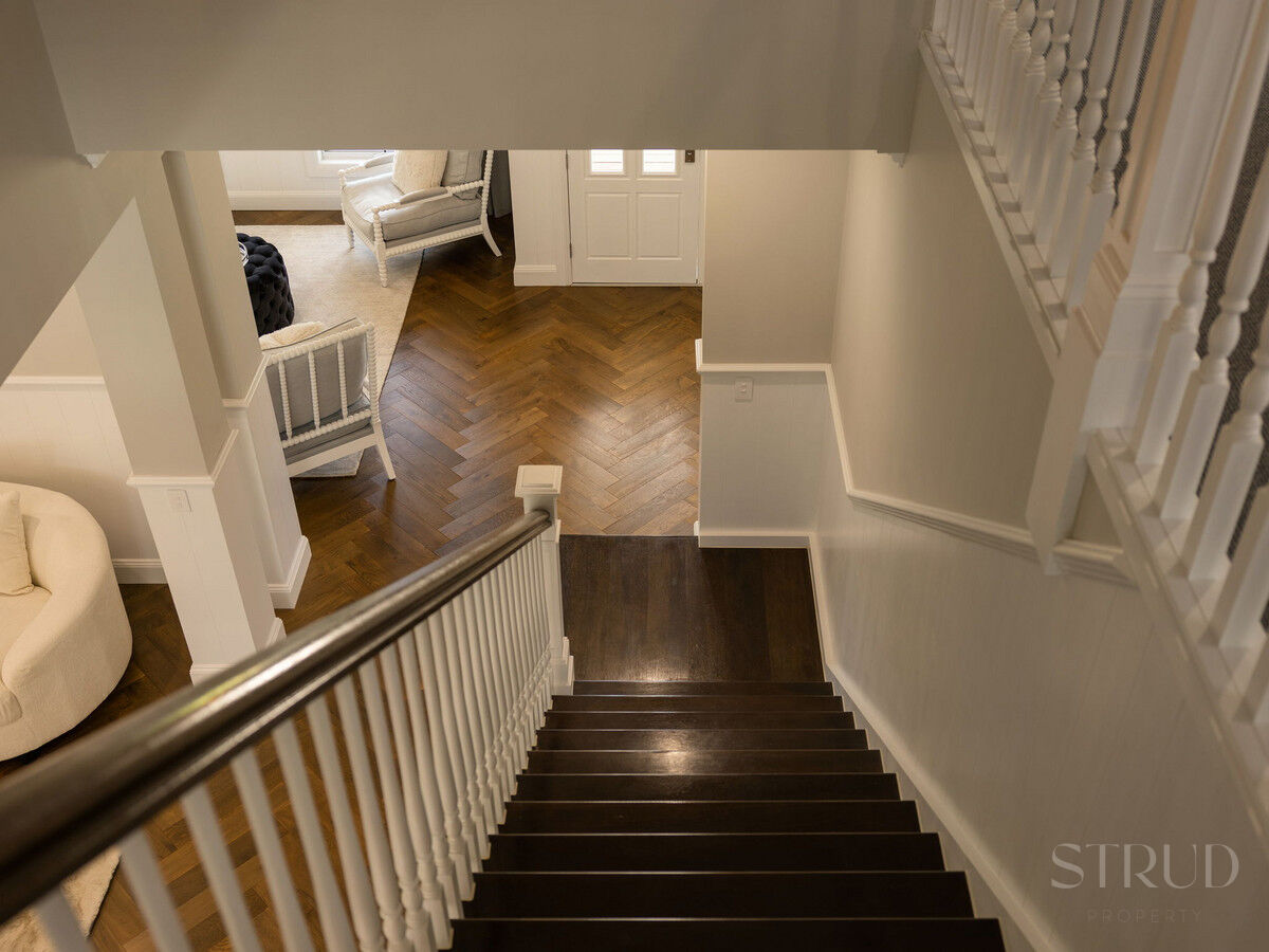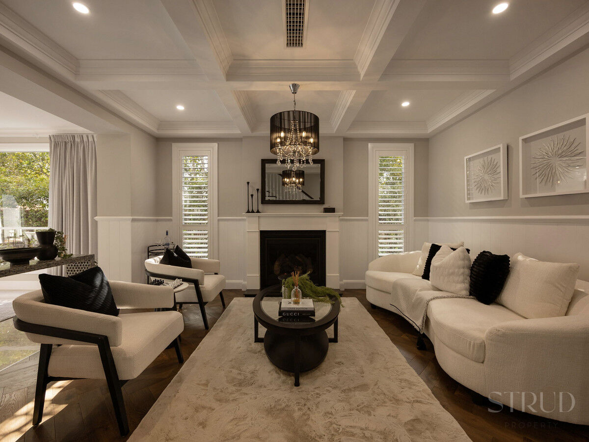 Step through the entry and feel the warmth of French oak flooring beneath your feet as light draws your eye toward the staircase, its sculptural form quietly defining the character of the home. To the right, a peaceful study offers a quiet retreat, while further inside, the formal lounge reveals itself—a refined space anchored by a fireplace that glows softly as evening settles in.