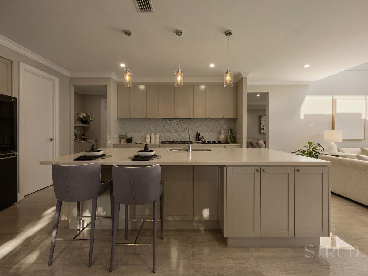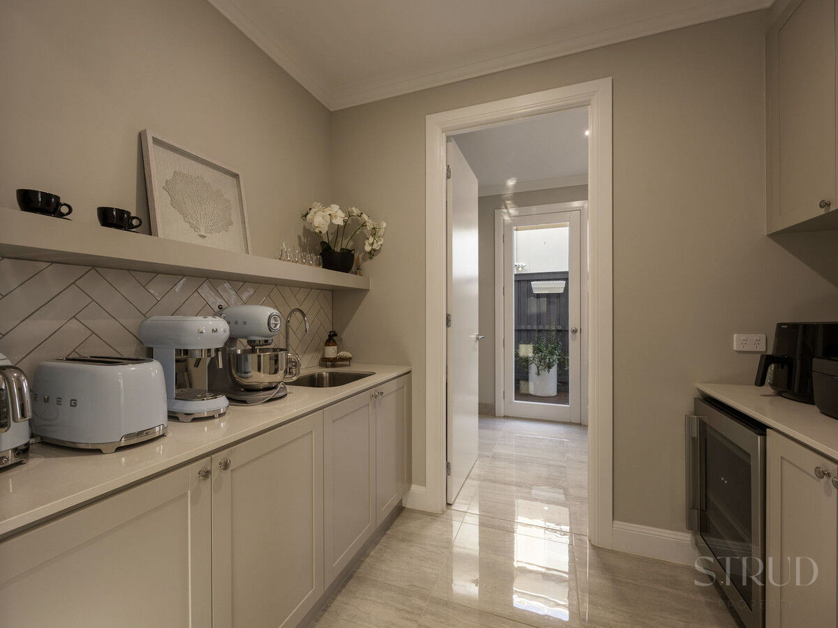 At its heart, the kitchen and galley form the home’s quiet gathering place, where design and function harmonise perfectly. Dual island benches and broad stone surfaces ground the space with presence and purpose, while a walk-in dry pantry adds thoughtful practicality. Crafted for morning calm, evening gatherings, and everything in between, every line and proportion has been considered to make the everyday feel quietly exceptional.