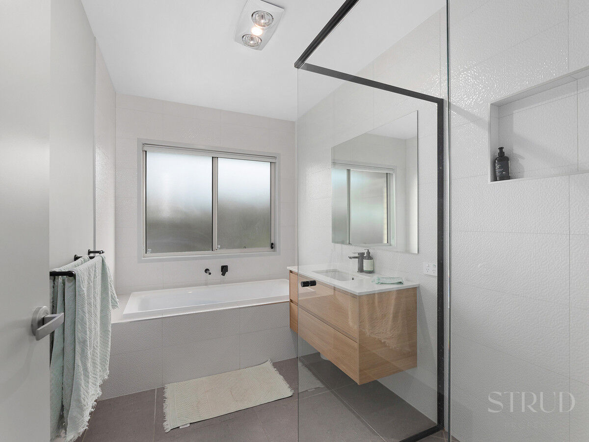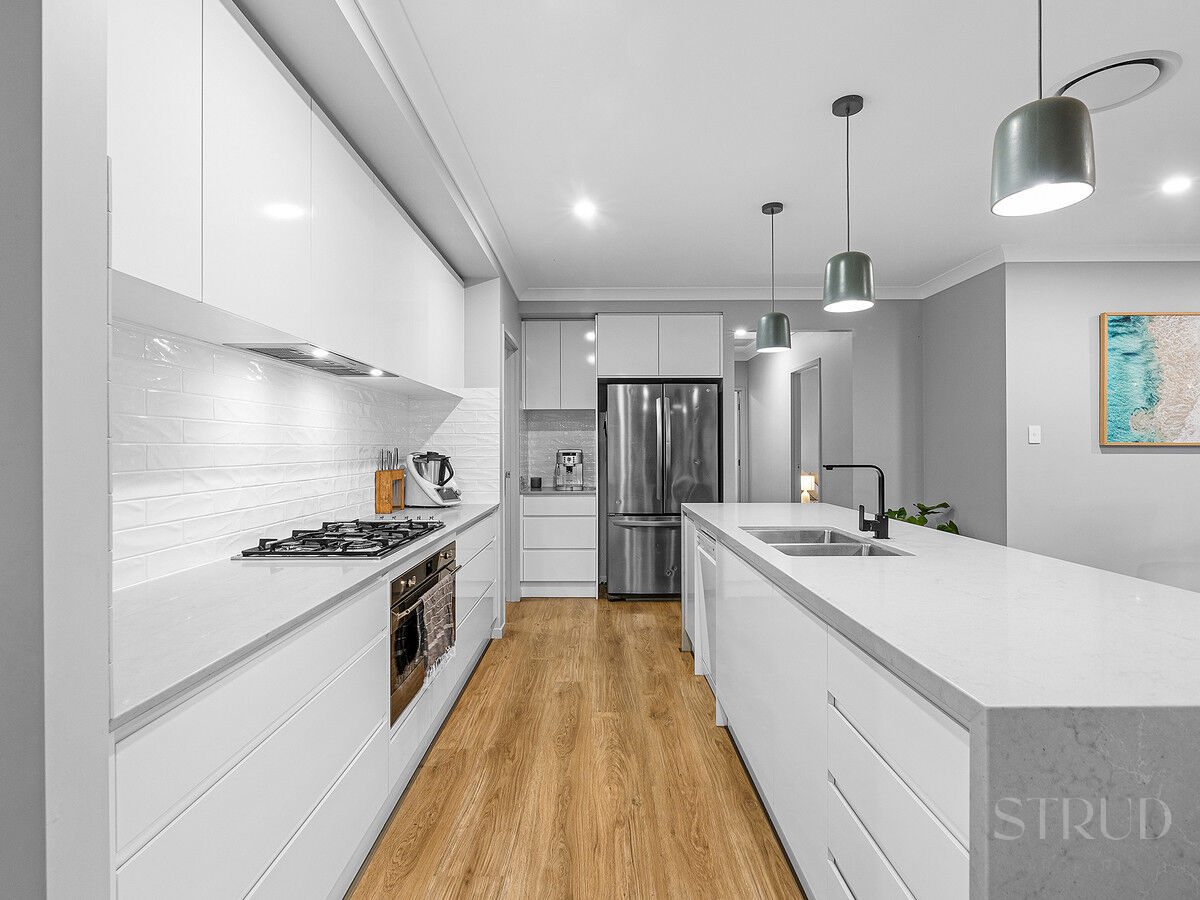The interior of the home has a sense of warmth as you enter through the oversized front door. Tastefully finished with a greyscale palette, the hybrid laminate flooring contrasts beautifully and the 40mm Caesarstone waterfall benchtop demands to be noticed. A Smeg gas cooktop and oven, paired with your very own oversized butler’s pantry will make entertaining a breeze as you utilise the alfresco.