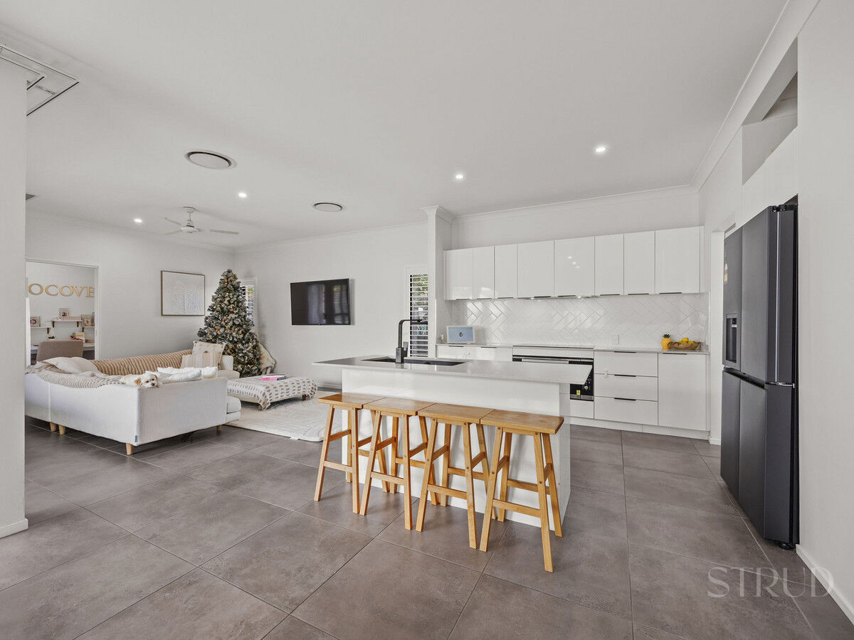 At the heart of the home is the designer kitchen — beautifully appointed with quality appliances, ample storage and a generous island bench — seamlessly flowing into the open-plan living and dining zones. This space connects effortlessly to the covered outdoor alfresco, creating a seamless indoor–outdoor experience ideal for hosting family and friends year-round.