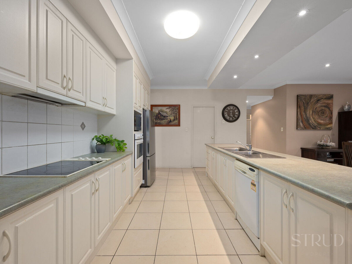 At the heart of the home, the galley-style kitchen connects seamlessly to the outdoor alfresco area overlooking the established yard and vegetable garden.