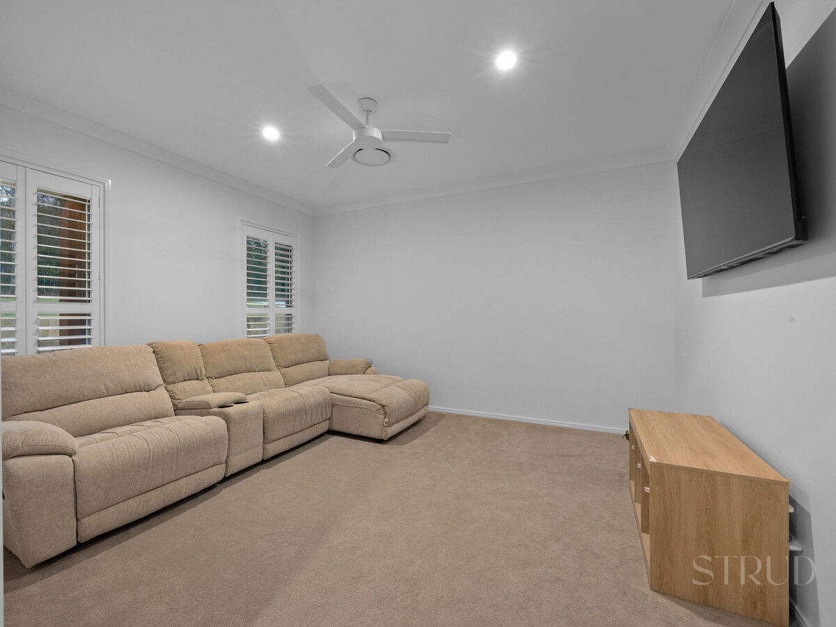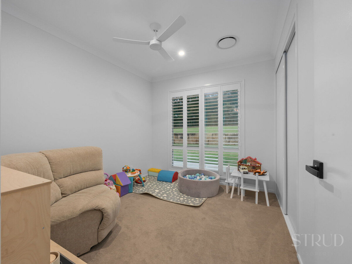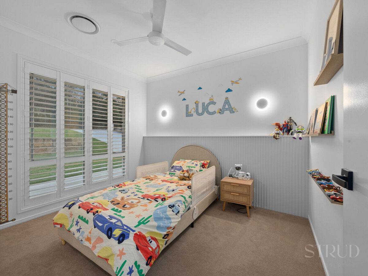 Crafted for entertaining, the kitchen forms the heart of the home with its 900mm gas cooktop, stone benchtops, walk-in pantry, and large servery window flowing to the tiled alfresco. This outdoor space, complete with remote-controlled block-out shutters, offers year-round enjoyment while overlooking the expansive backyard and treelined backdrop, a truly idyllic setting for hosting or relaxing.