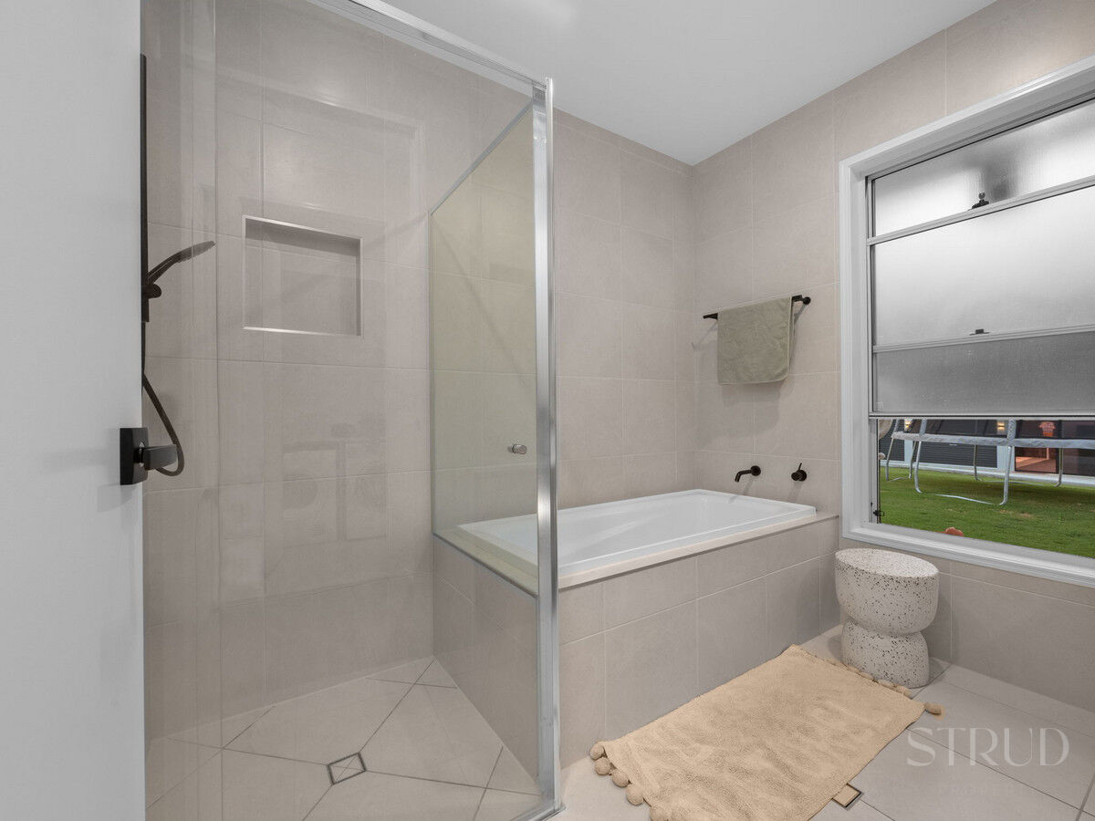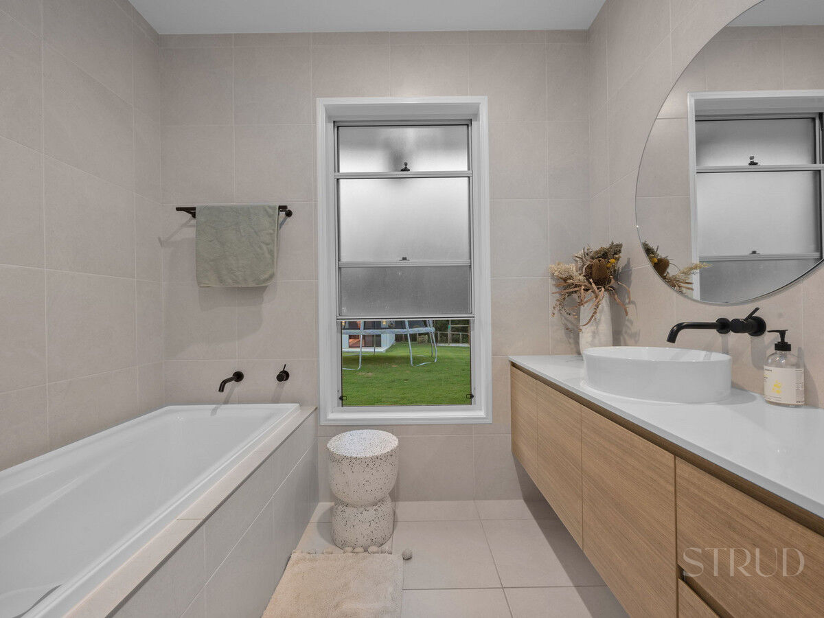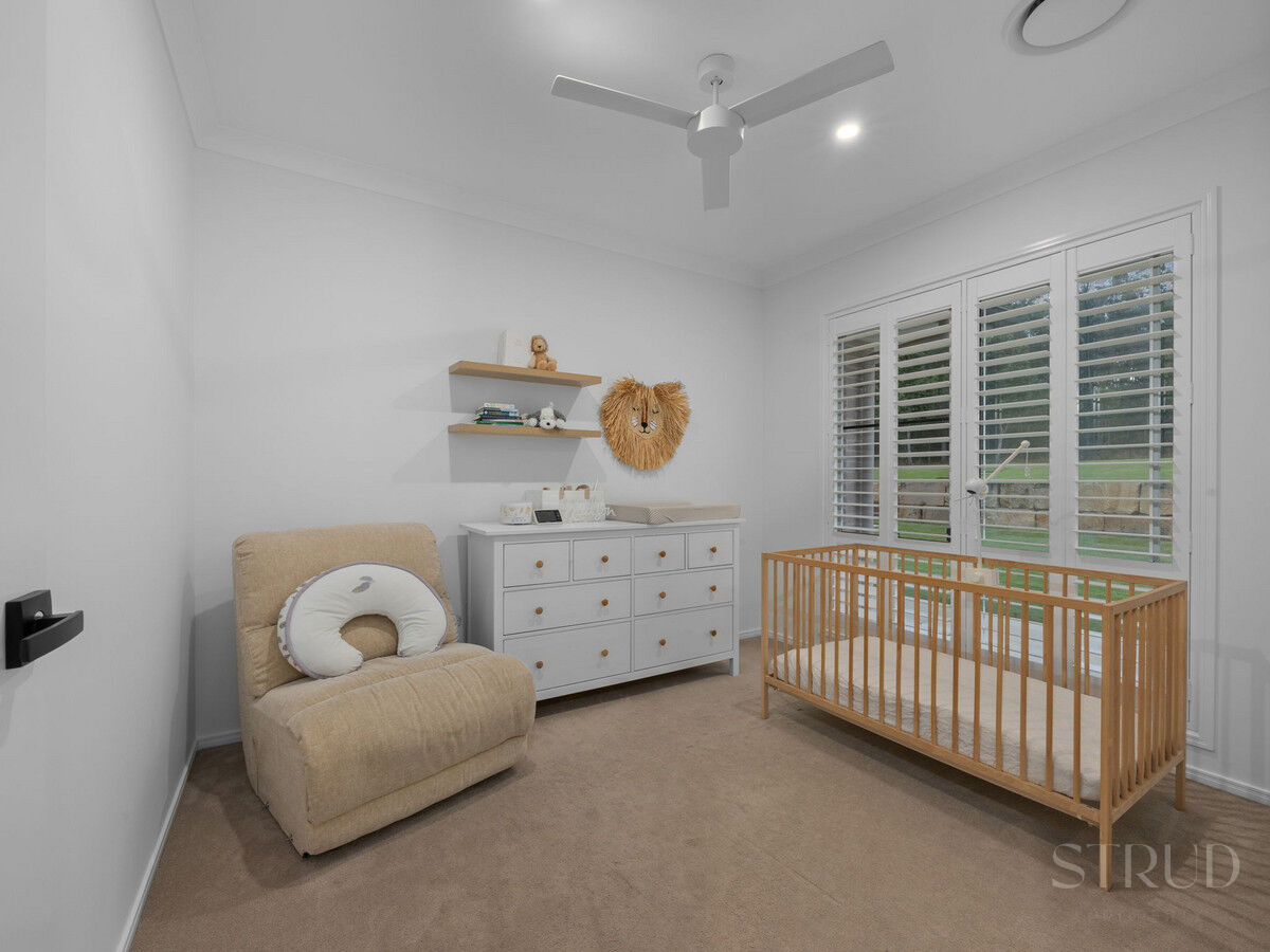 Crafted for entertaining, the kitchen forms the heart of the home with its 900mm gas cooktop, stone benchtops, walk-in pantry, and large servery window flowing to the tiled alfresco. This outdoor space, complete with remote-controlled block-out shutters, offers year-round enjoyment while overlooking the expansive backyard and treelined backdrop, a truly idyllic setting for hosting or relaxing.